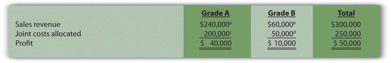 c $200,000 = $250,000 joint costs × ($240,000 Grade A sales value ÷ $300,000 total sales value).