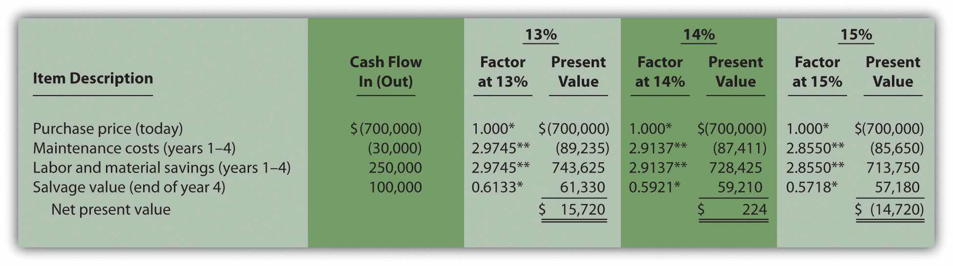 The purchase price and salvage value rows in Figure 8.4 "Alternative NPV Calculation for Jackson’s Quality Copies" represent one-time cash flows, and thus we use Figure 8.9 "Present Value of $1 Received at the End of " in the appendix to find the present value factor for these items (these are not annuities). The annual maintenance costs and annual labor savings rows represent cash flows that occur each year for seven years (these are annuities). We use Figure 8.10 "Present Value of a $1 Annuity Received at the End of Each Period for " in the appendix to find the present value factor for these items (note that the number of years, n, equals seven since the cash flows occur each year for seven years). Simply multiply the cash flow shown in column (A) by the present value factor shown in column (B) to find the present value for each line item. Then sum the present value column to find the NPV. This alternative approach results in the same NPV shown in Figure 8.2 "NPV Calculation for Copy Machine Investment by Jackson’s Quality Copies".