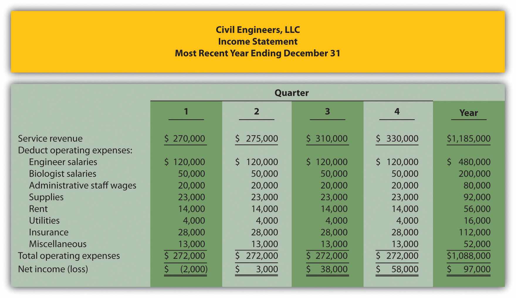 Prepare a quarterly budgeted income statement for Civil Engineers, LLC, and include a column summarizing the year.