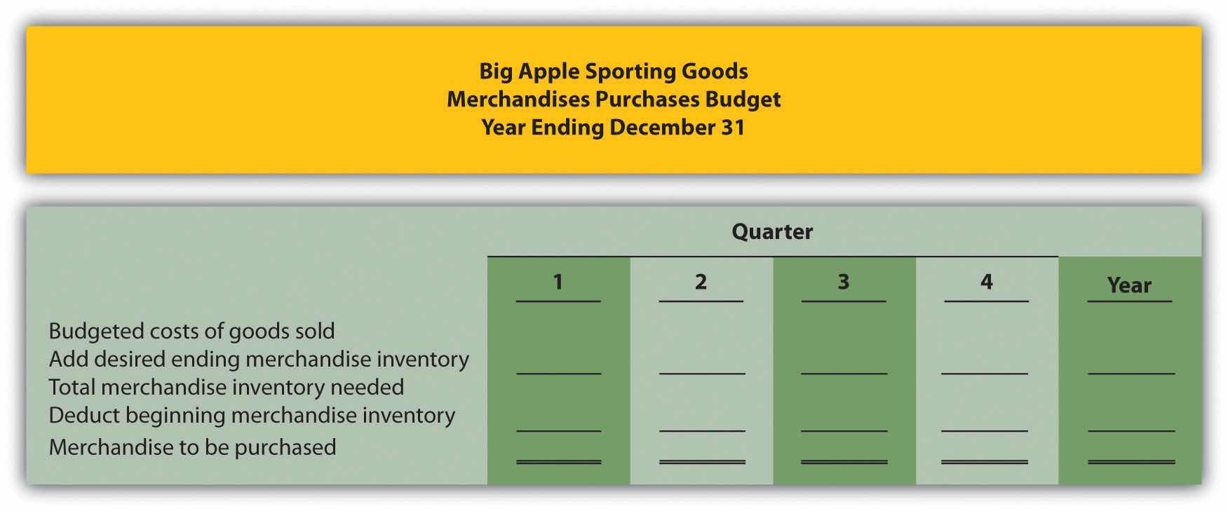 Prepare a quarterly merchandise purchases budget using the following format. All amounts are in dollars.