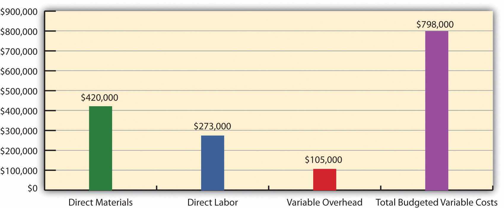 The standard cost presented in Figure 10.1 "Standard Costs at Jerry’s Ice Cream" shows the variable production costs expected to produce one unit. The flexible budget in Figure 10.2 "Flexible Budget for Variable Production Costs at Jerry’s Ice Cream" uses the standard cost information to show the variable production costs expected in total given a certain level of activity (210,000 units in this example). Later in the chapter, we compare the flexible budget presented in Figure 10.3 "Flexible Budget" to actual results and analyze the difference. The flexible budget graph presented in Figure 10.3 "Flexible Budget" shows that direct materials have the highest variable production cost at $420,000, followed by direct labor at $273,000 and variable overhead at $105,000.