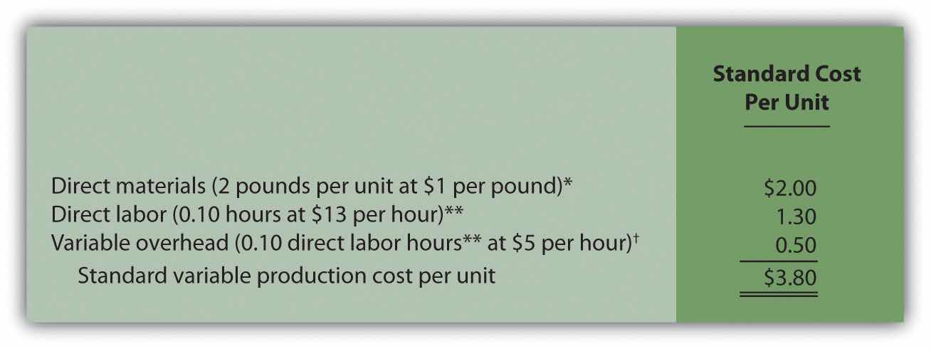 Answer: Notice in Figure 10.1 "Standard Costs at Jerry’s Ice Cream" that direct materials has two separate standards necessary to calculate the standard cost: standard quantity to produce 1 unit of product (2 pounds) and standard price ($1 per pound). Direct labor has two separate standards as well: standard hours to produce 1 unit of product (0.10 hours) and standard rate ($13 per hour). Variable manufacturing overhead also has 2 separate standards: standard hours to produce 1 unit of product (0.10 direct labor hours) and standard rate ($5 per hour). Thus there are two separate standards necessary to establish each standard cost or six standards in total to establish a standard cost for direct materials, direct labor, and variable manufacturing overhead.