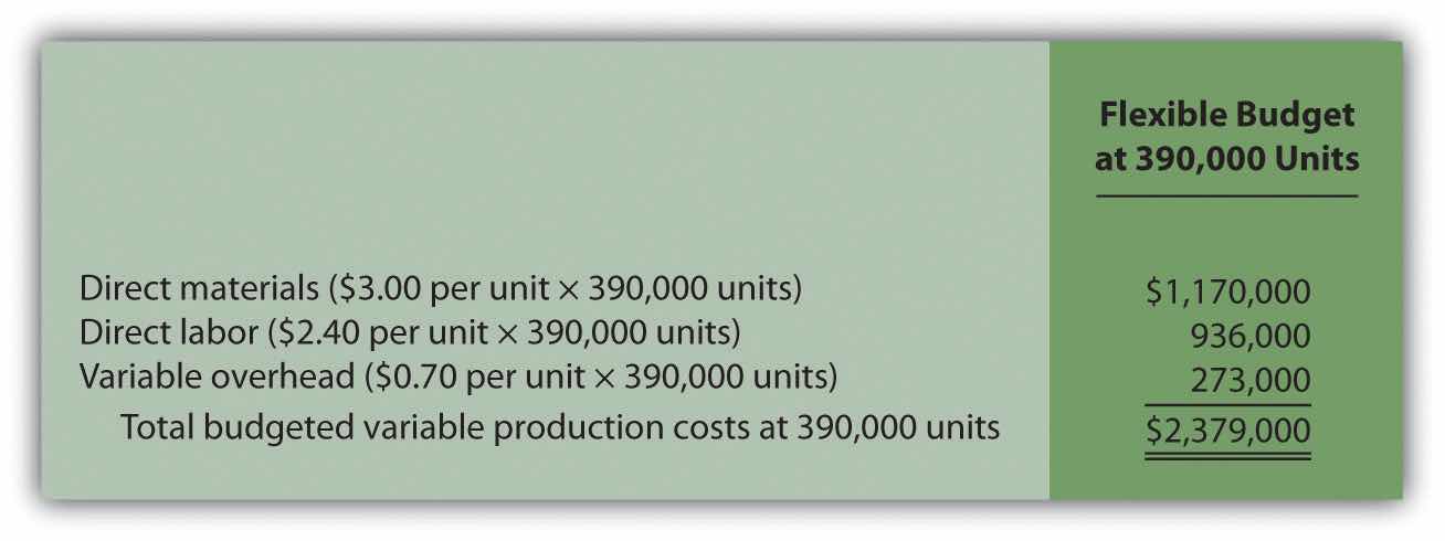 These standard costs can then be used to establish a flexible budget based on a given level of activity. For example, let’s use Jerry’s actual sales of 210,000 units. The variable production costs expected to produce these units are shown in the flexible budget in Figure 10.2 "Flexible Budget for Variable Production Costs at Jerry’s Ice Cream".