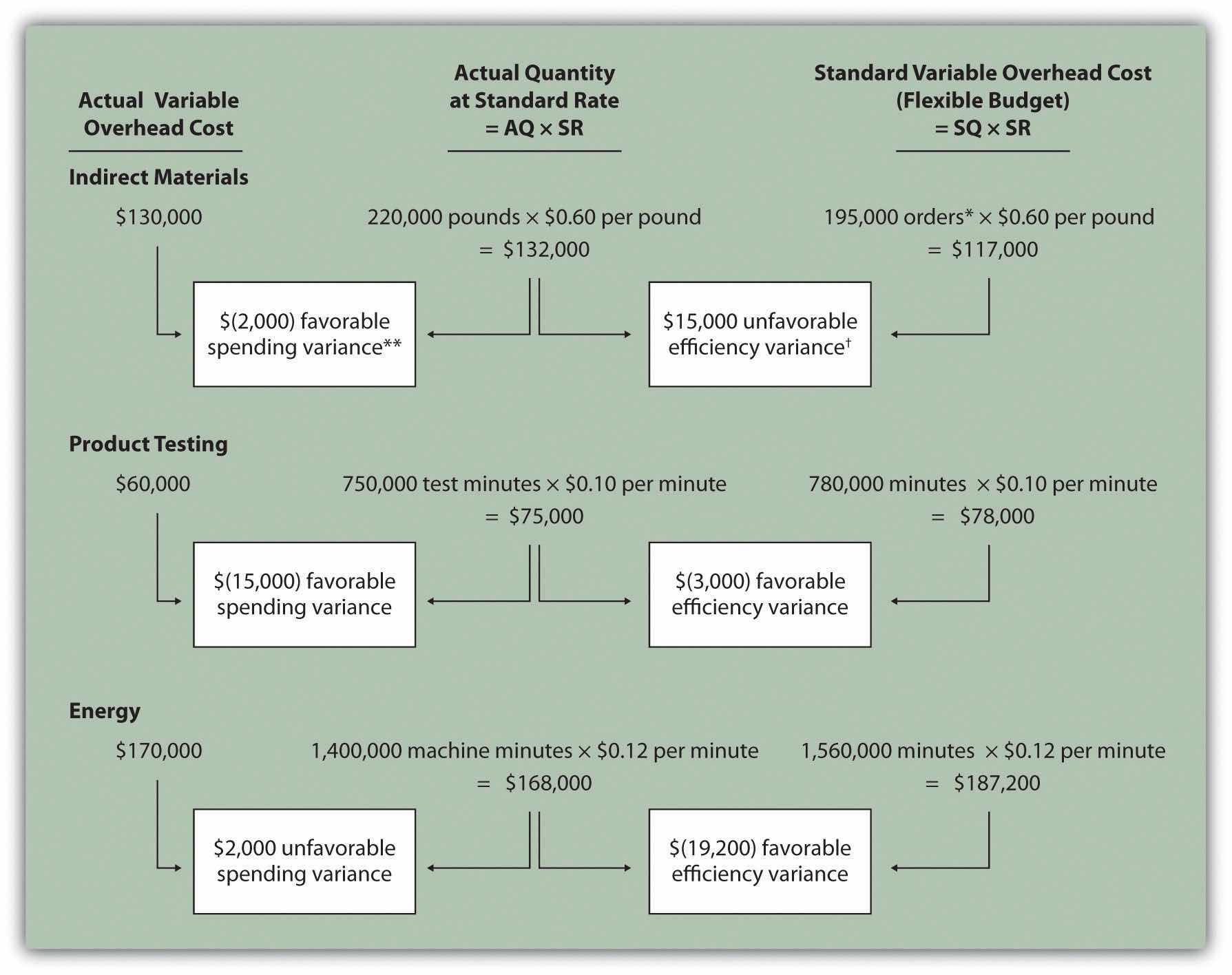 Recall that Jerry’s produced 210,000 units for the year. Figure 10.11 "Variable Overhead Variance Analysis for Jerry’s Ice Cream Using Activity-Based Costing" shows the resulting variable overhead variance analysis. Notice that the format for Figure 10.11 "Variable Overhead Variance Analysis for Jerry’s Ice Cream Using Activity-Based Costing" is the same as for Figure 10.8 "Variable Manufacturing Overhead Variance Analysis for Jerry’s Ice Cream". The variance calculations are also the same except variances are calculated for three activities rather than one. Note that total actual variable overhead costs remain at $100,000, but they are simply broken out into 3 activities ($100,000 = $42,000 for purchase orders + $31,000 for product testing + $27,000 for energy costs). Also, the flexible budget presented in Figure 10.11 "Variable Overhead Variance Analysis for Jerry’s Ice Cream Using Activity-Based Costing", totaling $115,500, differs from the flexible budget presented earlier since Jerry’s is using a different cost system in this example, which often results in different budgeted amounts ($115,500 = $52,500 purchase orders + $42,000 product testing + $21,000 energy).