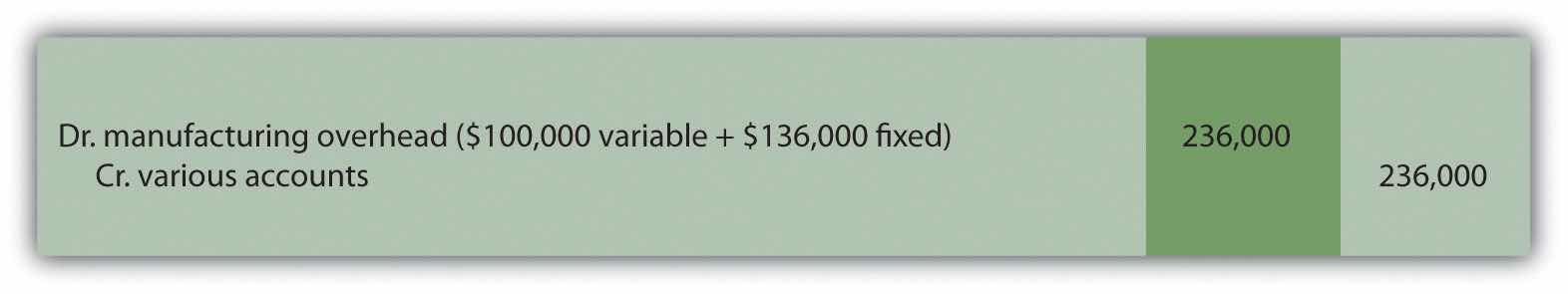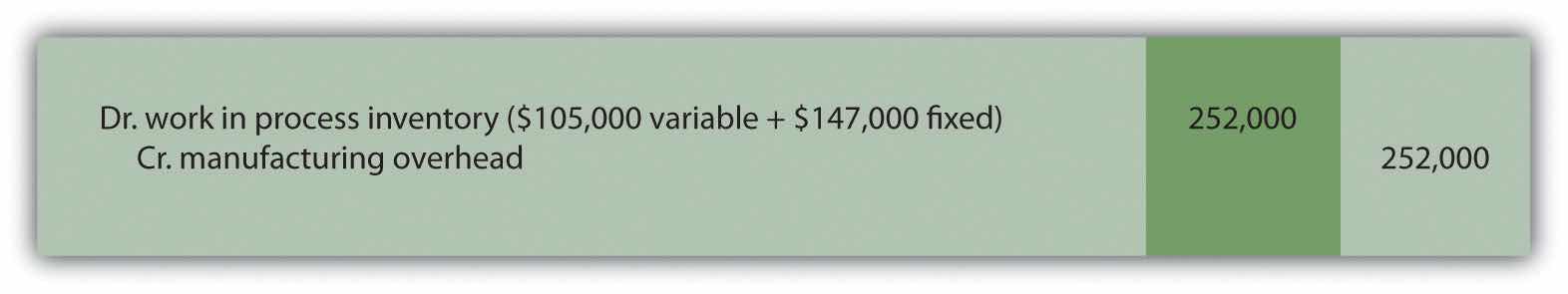 The next entry reflects overhead applied to products. This information comes from the right side of Figure 10.14 "Comparison of Variable and Fixed Manufacturing Overhead Variance Analysis for Jerry’s Ice Cream".