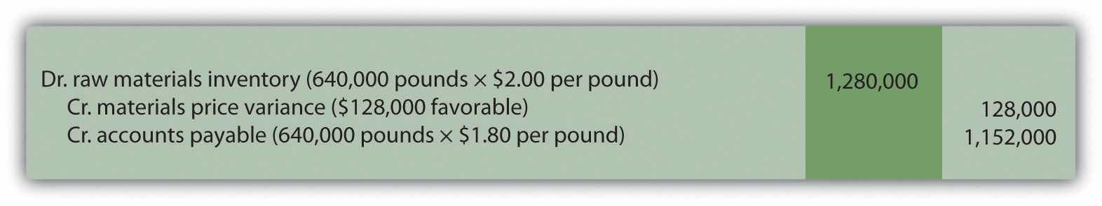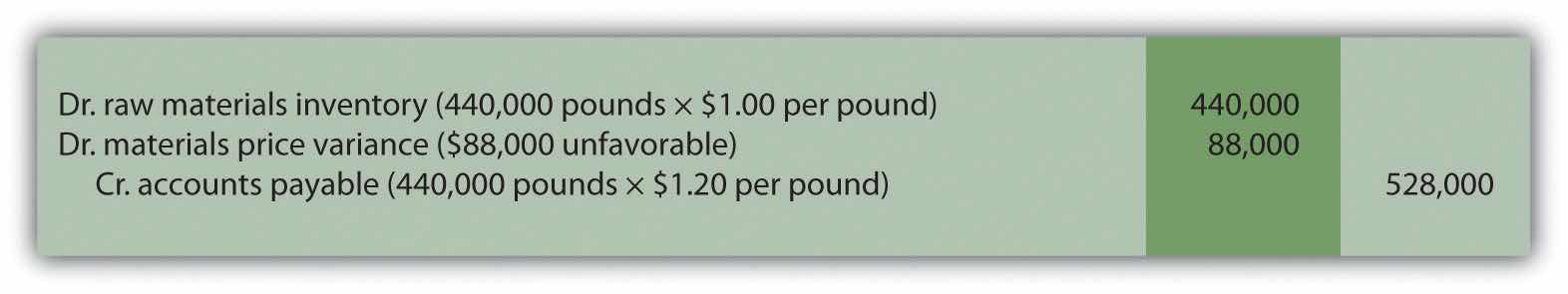 The entry to record the purchase of direct materials and related price variance shown in Figure 10.4 "Direct Materials Variance Analysis for Jerry’s Ice Cream" is