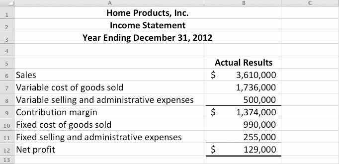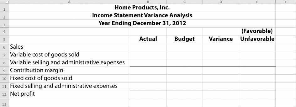 Using Excel to Perform Budget Versus Actual Analysis. The management of Home Products, Inc., prepared the following budgeted income statement for the year ending December 31, 2012.