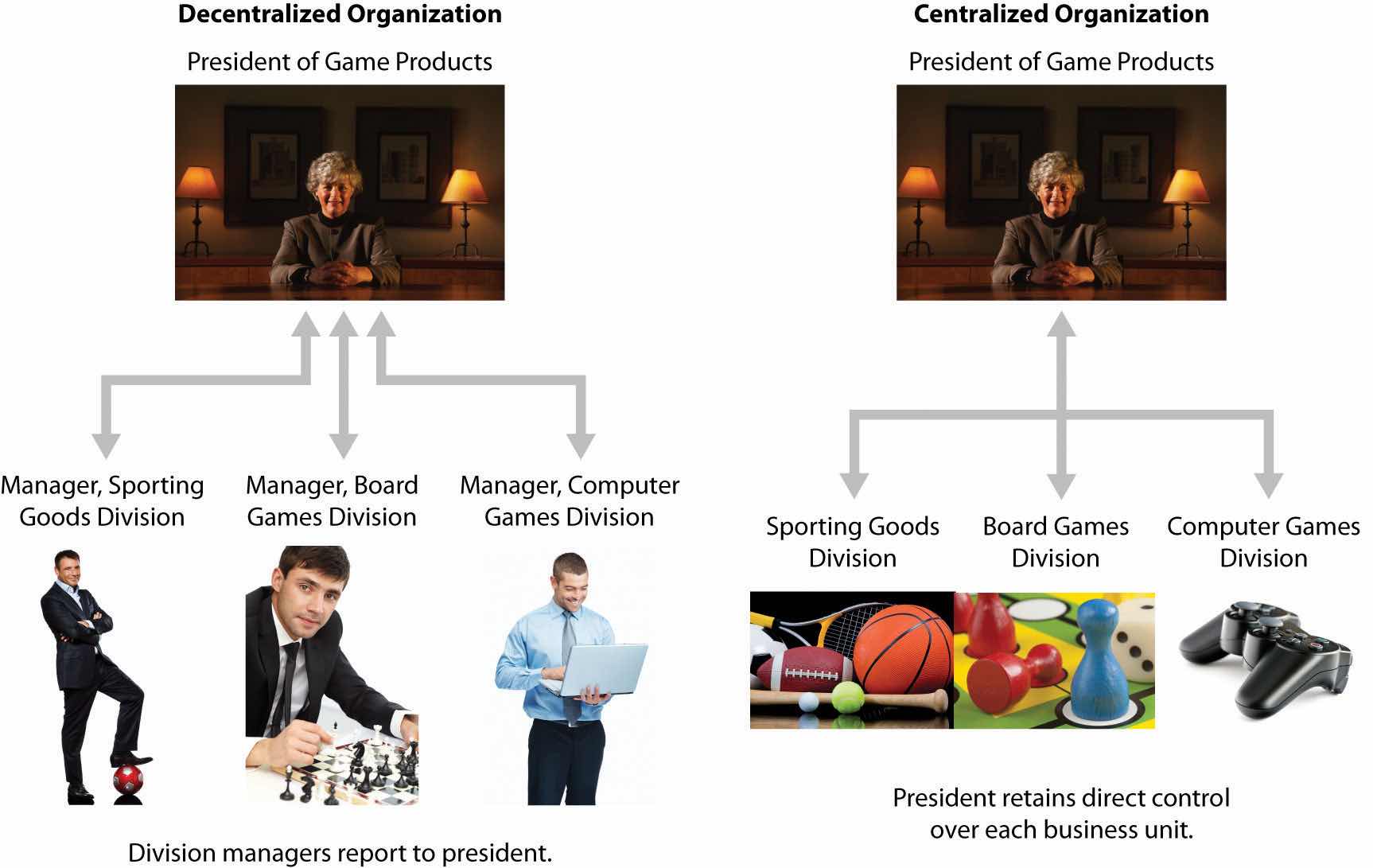Although Game Products ultimately decided to decentralize operations, there are advantages and disadvantages to decentralizing. Figure 11.1 "Decentralized Versus Centralized Organizations" illustrates how operations would look at Game Products, Inc., if operations were decentralized or if they remained centralized.