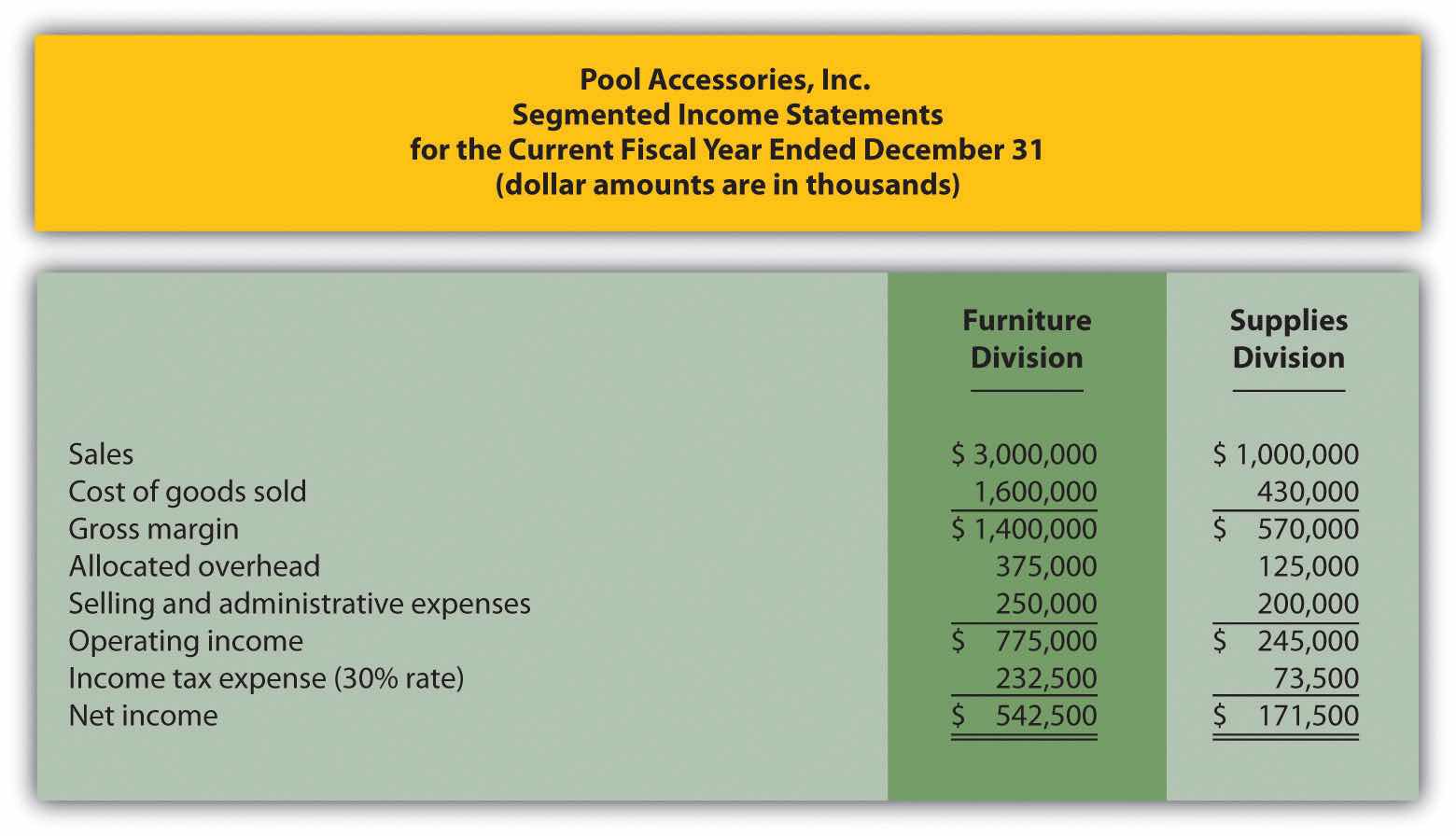 Creating a Segmented Income Statement Using Excel. Pool Accessories, Inc., has two divisions—Furniture and Supplies. The following segmented financial information is for the most recent fiscal year ended December 31.