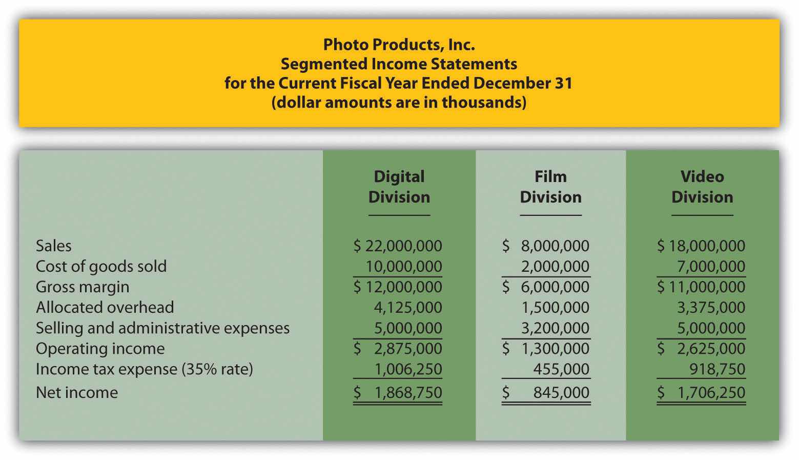 Segmented Net Income. Photo Products, Inc., has three divisions—Digital, Film, and Video. The following segmented financial information is for the most recent fiscal year ended December 31.