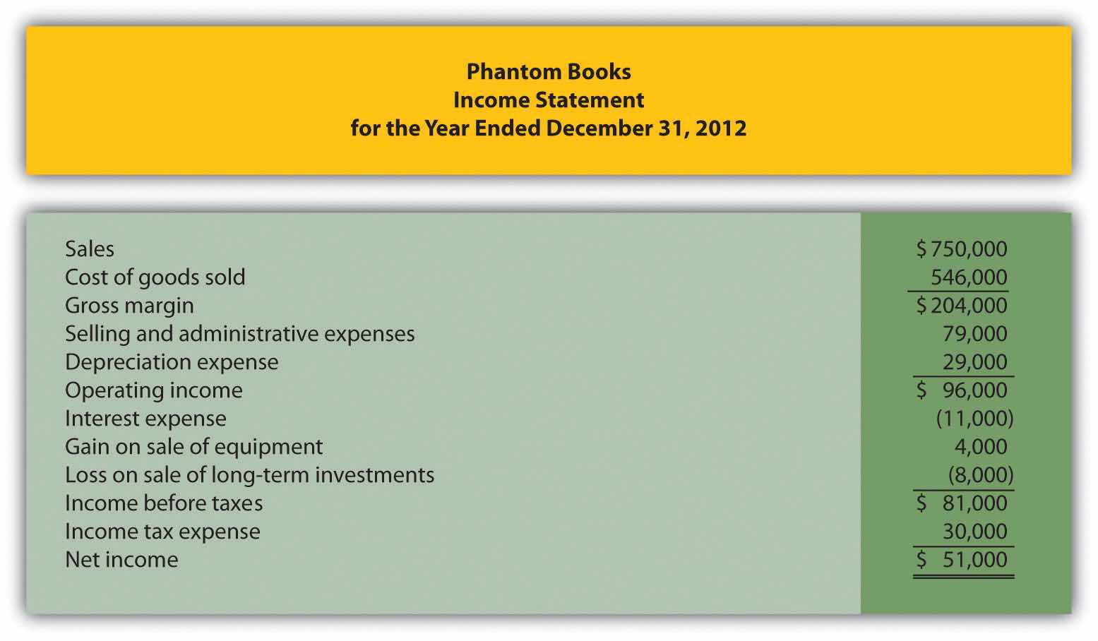 Start with net income from the income statement; make the appropriate adjustments for (1) noncash expenses, such as depreciation and amortization; (2) gains and losses related to investing activities; and (3) changes in current assets other than cash and current liabilities. The operating activities section of the statement of cash flows for Phantom Books appears as follows.