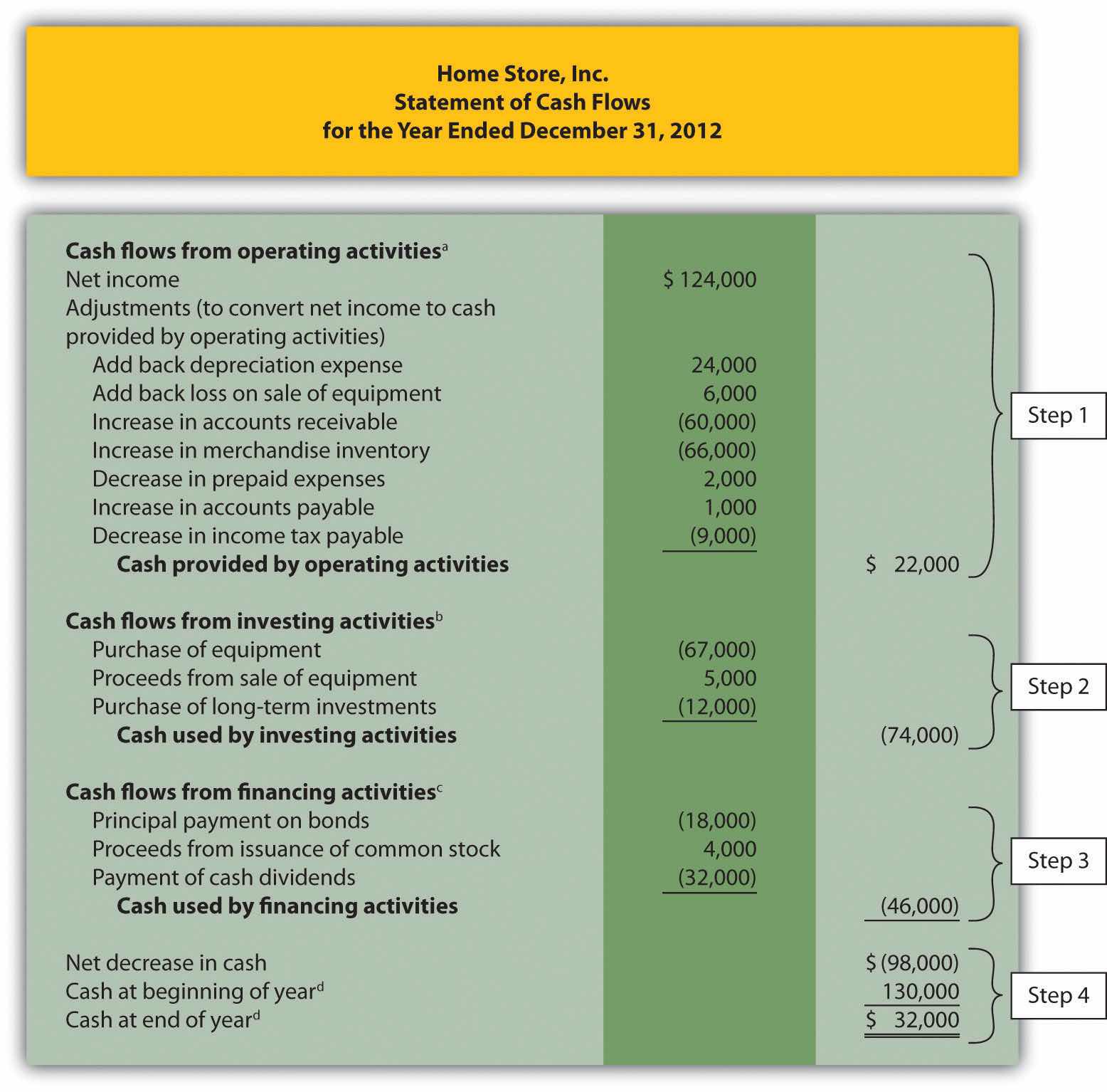 Figure 12.9 "Cash Flows at Home Store, Inc." provides a summary of cash flows for operating activities, investing activities, and financing activities for Home Store, Inc., along with the resulting total decrease in cash of $98,000.