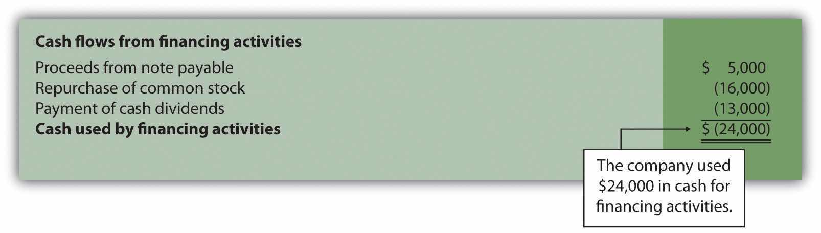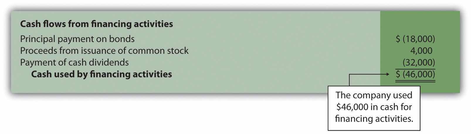 Figure 12.7 "Financing Activities Section of Statement of Cash Flows (Home Store, Inc.)" shows the three financing activities described previously: (1) an $18,000 decrease in cash from paying off the principal amount of bonds, (2) a $4,000 increase in cash from the issuance of common stock, and (3) a $32,000 decrease in cash from the payment of cash dividends. Examine Figure 12.7 "Financing Activities Section of Statement of Cash Flows (Home Store, Inc.)" carefully noting the impact these three items have on cash and the resulting cash used by financing activities of $46,000.