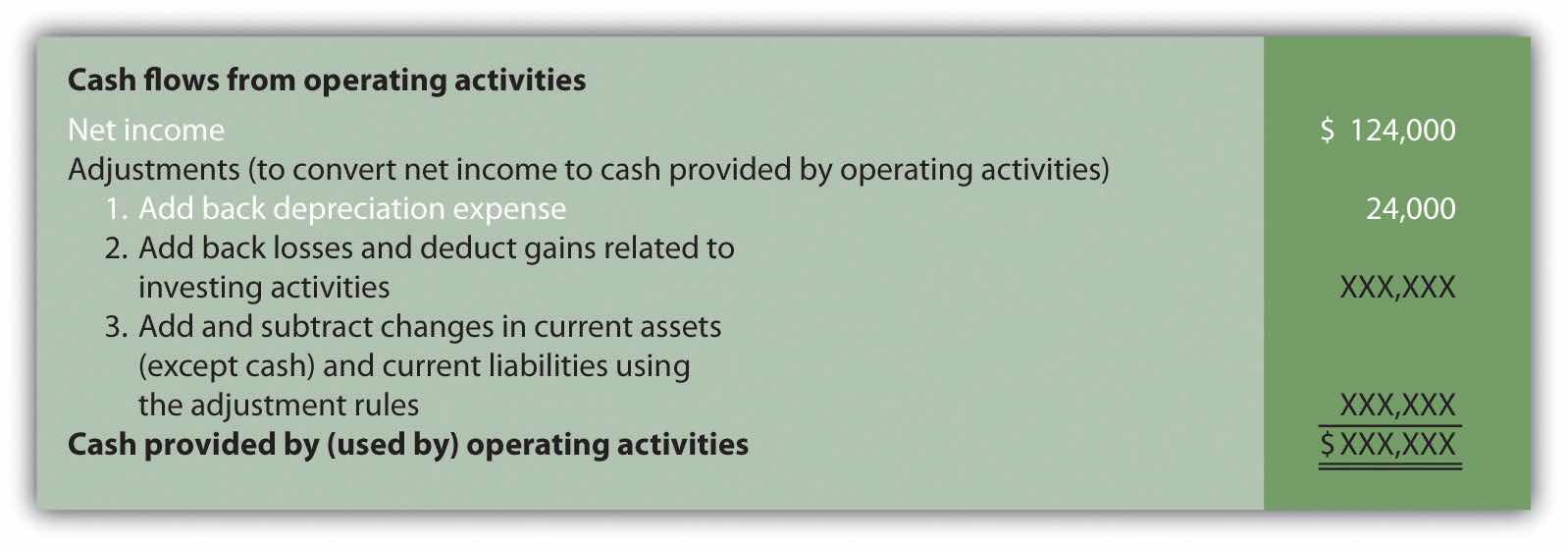 Three general types of adjustments are necessary to convert net income to cash provided by operating activities. These three types of adjustments are shown in Figure 12.4 "Operating Activities Format and Adjustments", which also displays the format used for the operating activities section of the statement of cash flows. Examine this figure carefully.
