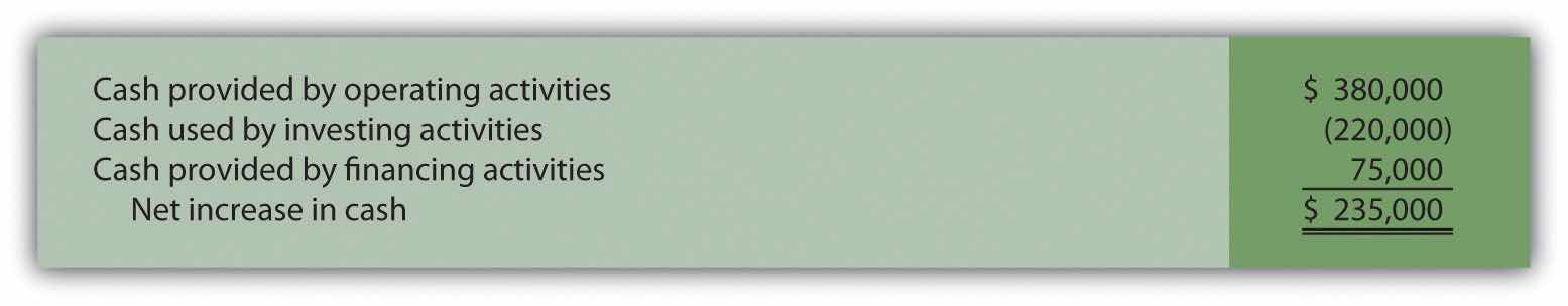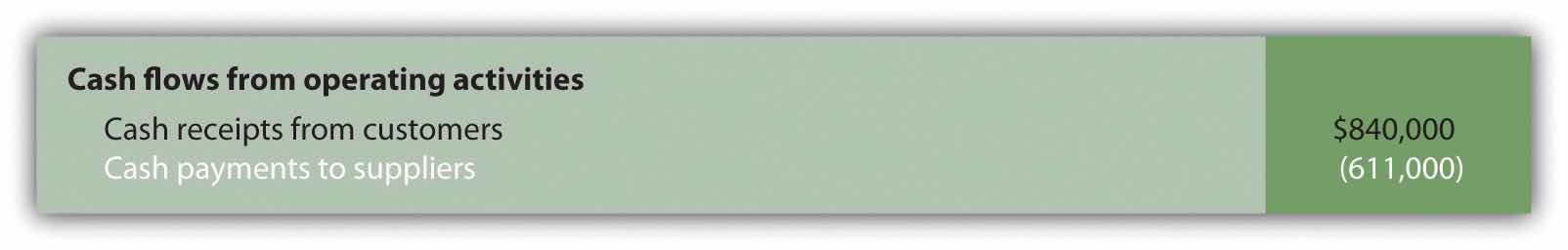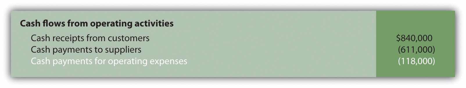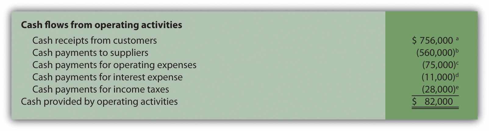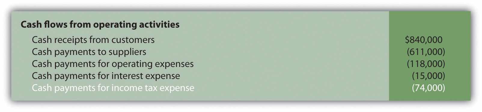 The first item shown in Figure 12.10 "Operating Activities Format Using the Direct Method", cash receipts from customers, is revenue (or sales) on a cash basis. The second item, cash payments to suppliers, is cost of goods sold on a cash basis. The third item, cash payments for operating expenses (also called selling and administrative expenses), is operating expenses on a cash basis. The fourth item, cash payments for interest expense, is interest expense on a cash basis. And the fifth item, cash payments for income taxes, is income tax expense on a cash basis. Cash receipts minus cash payments results in cash provided by operating activities.
