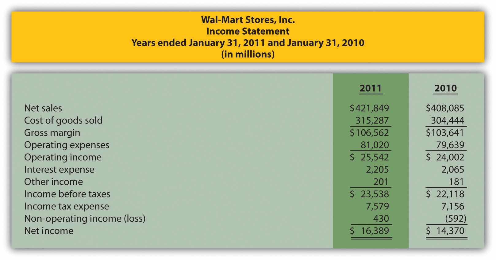Balance Sheet Trend and Common-Size Analysis. The following condensed income statement and balance sheet are for Wal-Mart Stores, Inc. (note that Wal-Mart’s 2010 fiscal year ends on January 31, 2011. This is called the 2010 fiscal year because only one month is in 2011, the other 11 months of the fiscal year are in 2010, and the company has chosen to refer to this as the 2010 fiscal year. This same concept applies to fiscal year 2009.)