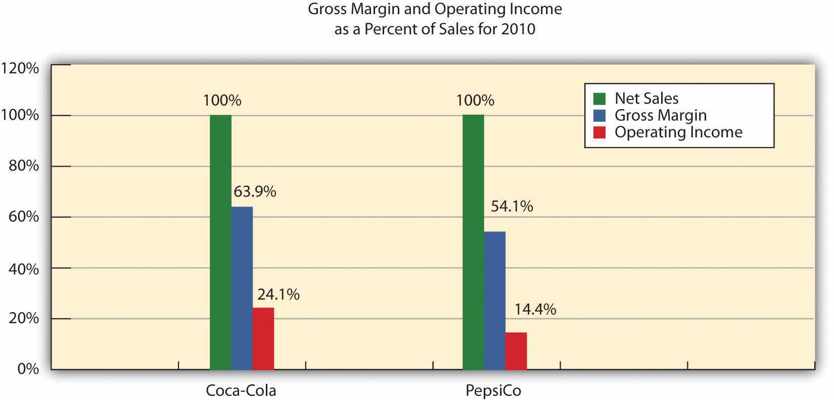 Notice that PepsiCo has the highest net sales at $57,838,000,000 versus Coca-Cola at $35,119,000,000. Once converted to common-size percentages, however, we see that Coca-Cola outperforms PepsiCo in virtually every income statement category. Coca-Cola’s cost of goods sold is 36.1 percent of net sales compared to 45.9 percent at PepsiCo. Coca-Cola’s gross margin is 63.9 percent of net sales compared to 54.1 percent at PepsiCo. Coca-Cola’s operating income is 24.1 percent of sales compared to 14.4 percent at PepsiCo. Figure 13.8 "Comparison of Common-Size Gross Margin and Operating Income for " compares common-size gross margin and operating income for Coca-Cola and PepsiCo.