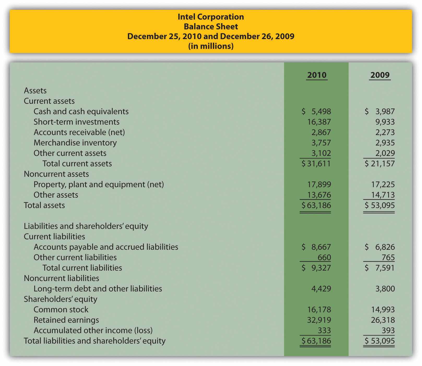 Intel’s income statement and balance sheet are provided as follows. The price for 1 share of common stock at December 25, 2010, the end of Intel’s fiscal year, was $20.13. The number of shares issued and outstanding at December 25, 2010, totaled 5,581,000,000. Assume all sales were on account.