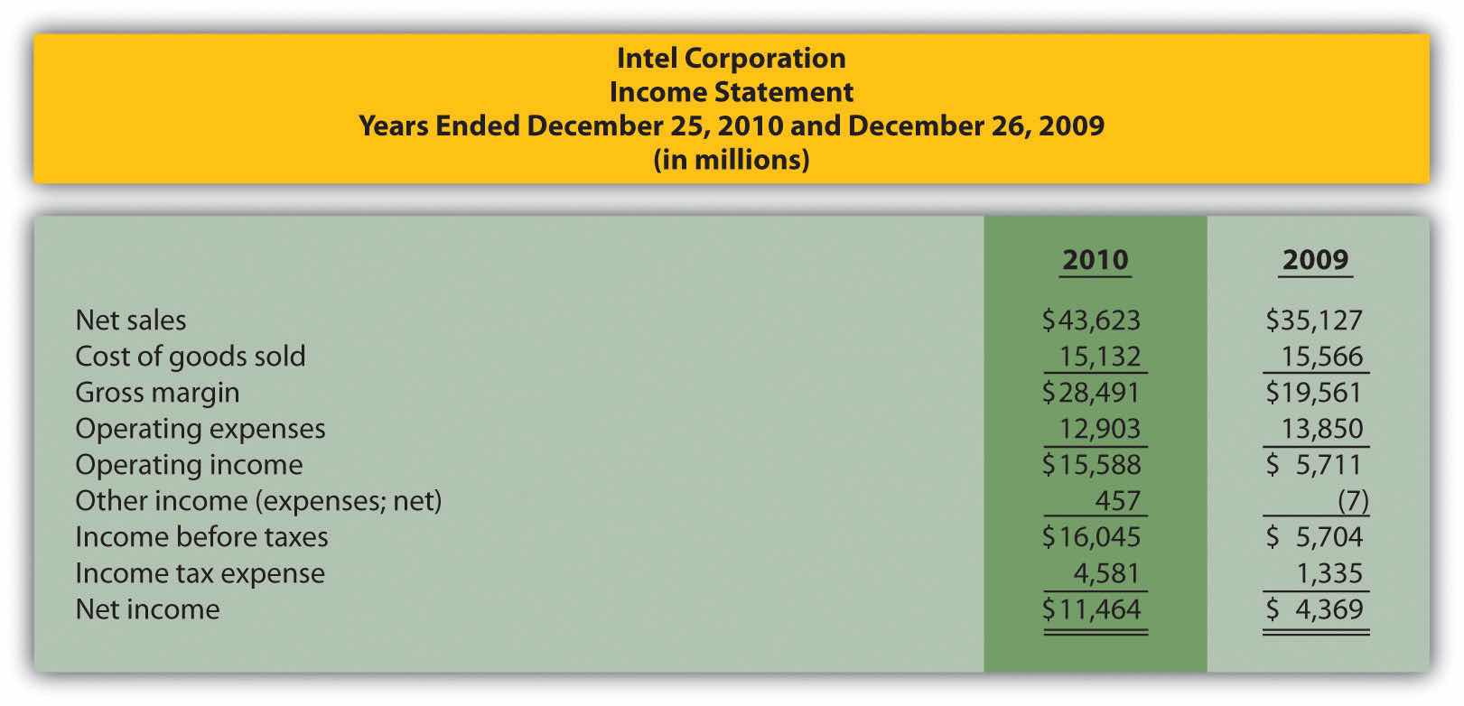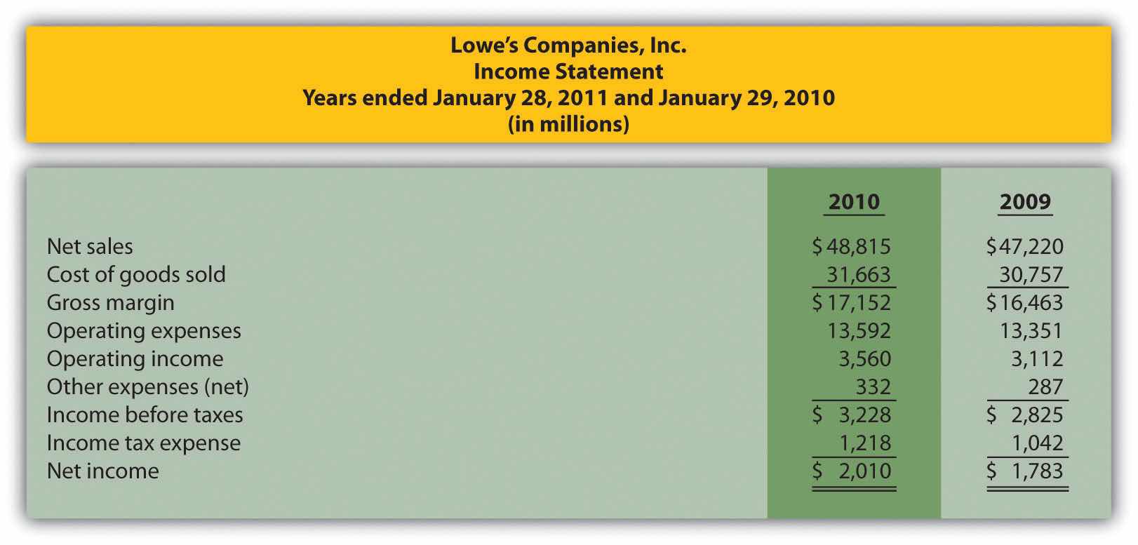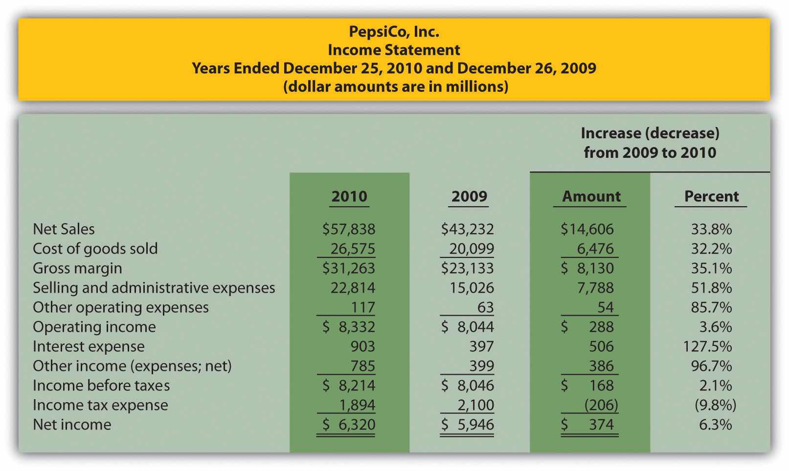 Note: Percent change for each line item is found by dividing the increase (decrease) amount by the 2009 amount. For example, net sales 33.8 percent increase equals $14,606 ÷ $43,232.