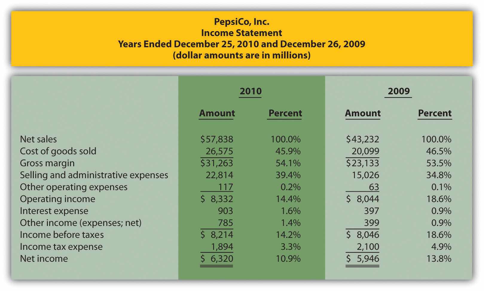 The composition of PepsiCo’s income statement remained relatively consistent from 2009 to 2010. The most notable change occurred with selling and administrative expenses, which increased from 34.8 percent of sales in 2009 to 39.4 percent of sales in 2010. This in turn drove down operating income from 18.6 percent in 2009 to 14.4 percent in 2010. This also likely caused the decrease in income before taxes, income tax expense, and net income.
