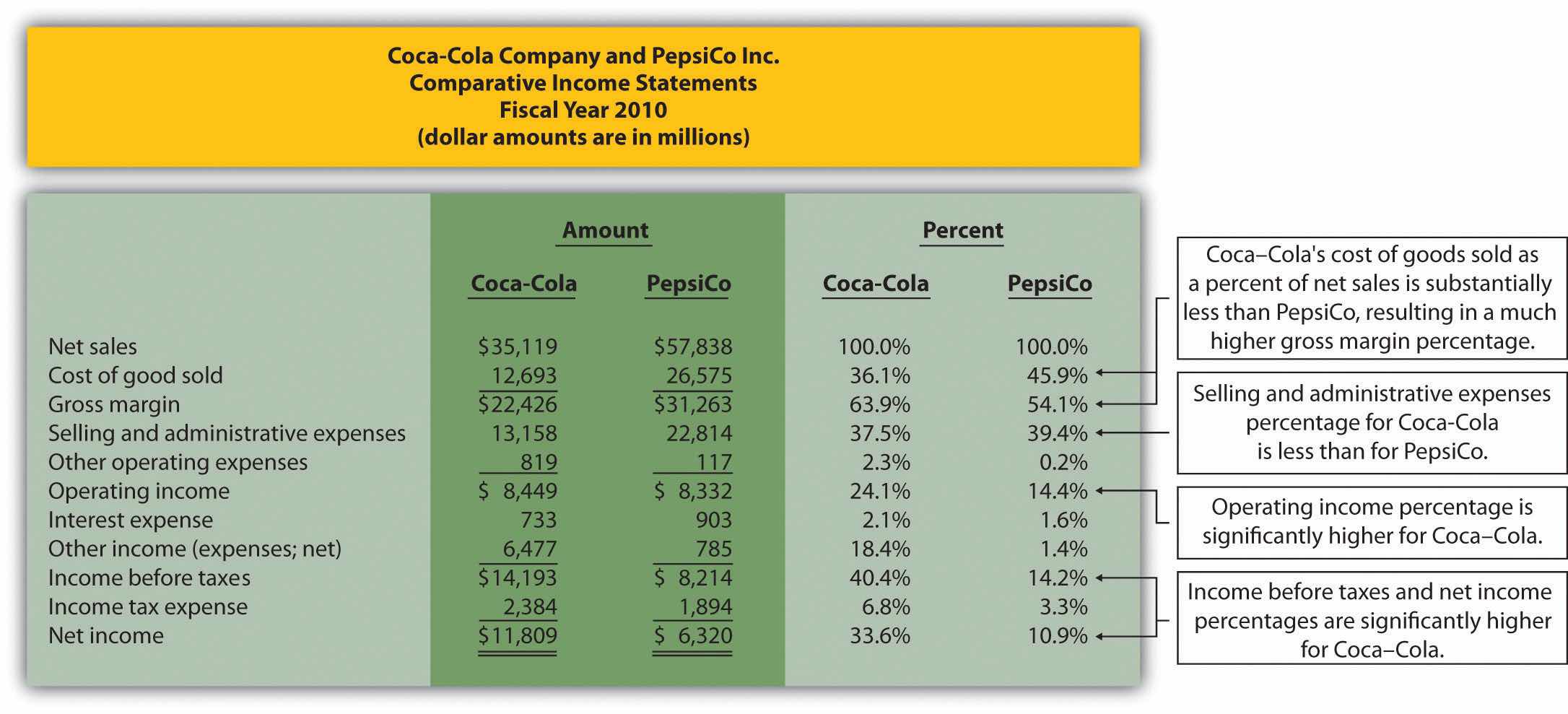 Common-size analysis enables us to compare companies on equal ground, and as this analysis shows, Coca-Cola is outperforming PepsiCo in terms of income statement information. However, as you will learn in this chapter, there are many other measures to consider before concluding that Coca-Cola is winning the financial performance battle.