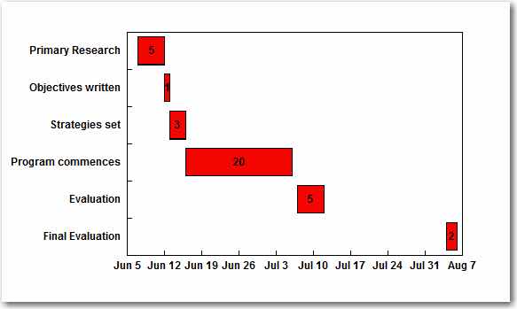 Two additional components to the public relations process usually are developed during the communication and action stage: the planning calendar and the budget. Once the tactics have been determined it is best to plan the development and execution of the tactics using a calendaring tool such as a Gantt chart (see Figure 9.2 "Sample Gantt Chart (Numbers Within Bars Are Days to Accomplish Task)"). A Gantt chart is a horizontal flow chart that provides a graphic illustration of when tasks should begin and end in comparison to all other tasks.