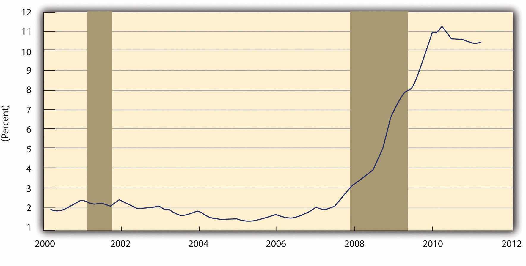 The troubles began with a major housing asset bubble. As shown in Figure 13.4 "Case-Shiller U.S. Home Price Composite Index, 2000–2010", between January 2000 and 2006, a major index of housing prices in the United States more than doubled. (Prices went up more in some areas than in others because real estate is a local asset.) Home prices rose rapidly for several reasons. As shown in Figure 13.5 "U.S. interest rates, 2000–2010", mortgage rates were quite low, to a large extent because the Federal Reserve kept the federal funds rate, the rate at which banks lend to each other overnight, very low.
