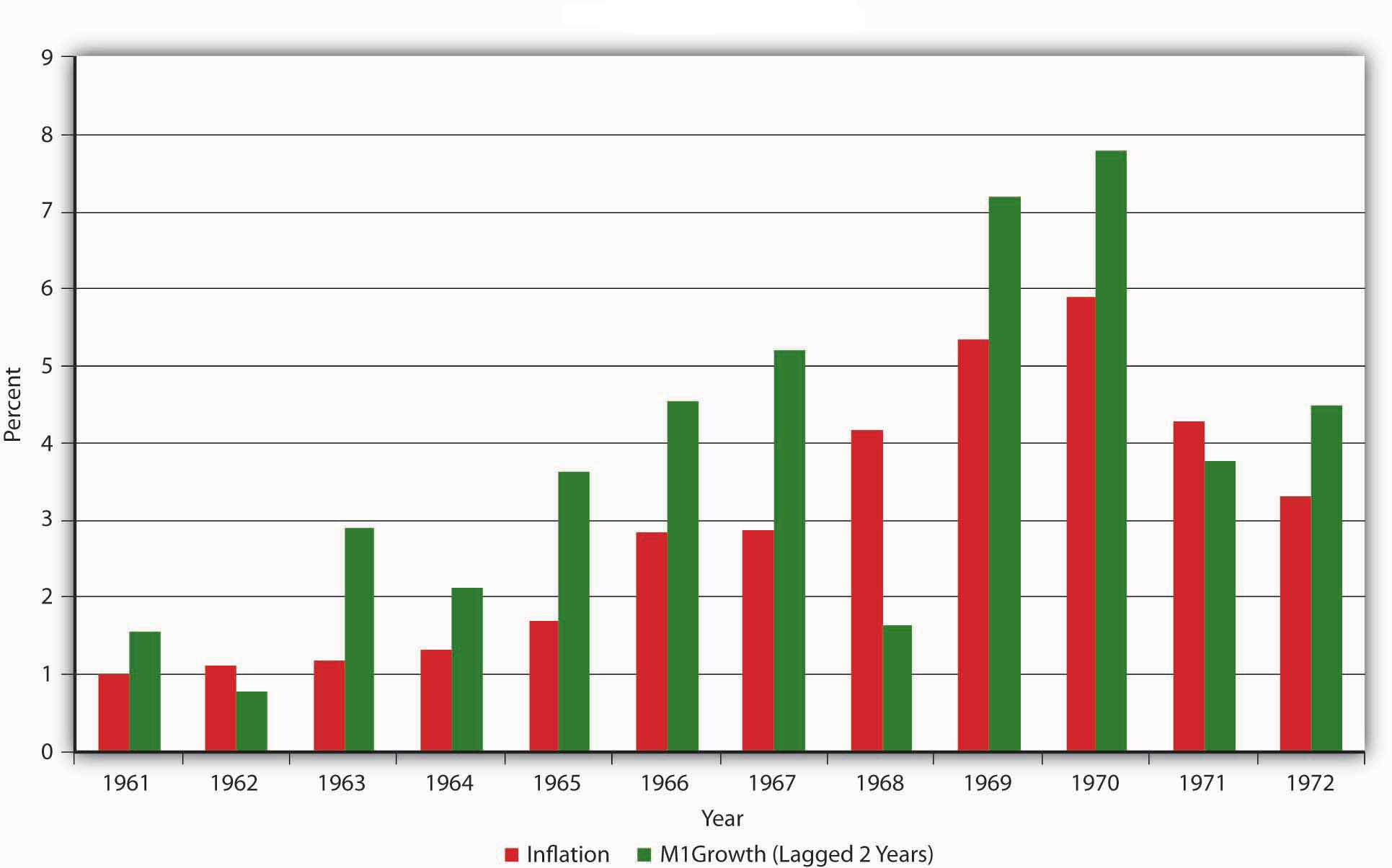 Figure 25.2 "U.S. M1 and P growth" compares inflation with M1 growth laggedThe time it takes for a policy to change on a variable, a cause to create an observable effect. two years. What does the data tell you? Now look at Figure 25.3 "Government debt-to-GDP ratio" and Figure 25.4 "U.S. unemployment rates, 1961–1972". What caused M1 to grow during the 1960s?