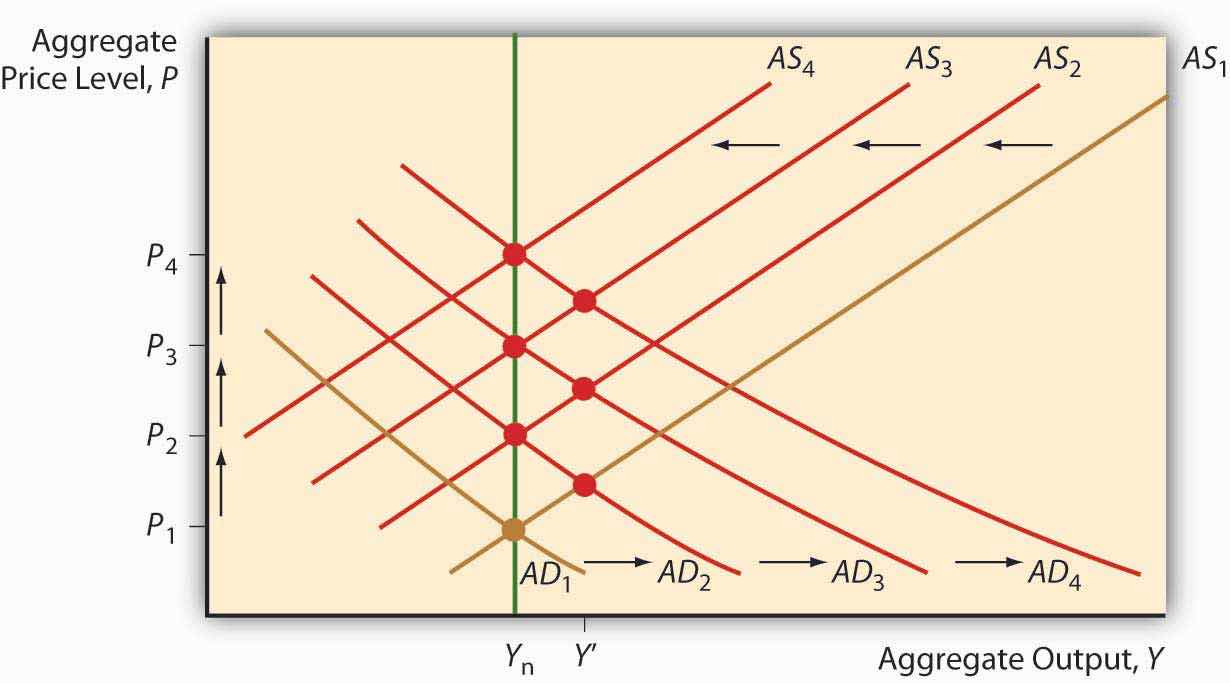 Economists also have a structural model showing a causal link between money supply growth and inflation at their disposal, the AS-AD model. Recall that an increase in MS causes the AD curve to shift right. That, in turn, causes the short-term AS curve to shift left, leading to a return to Ynrl but higher prices. If the MS grows and grows, prices will go up and up, as in Figure 25.1 "Inflation as a response to a continually increasing money supply".