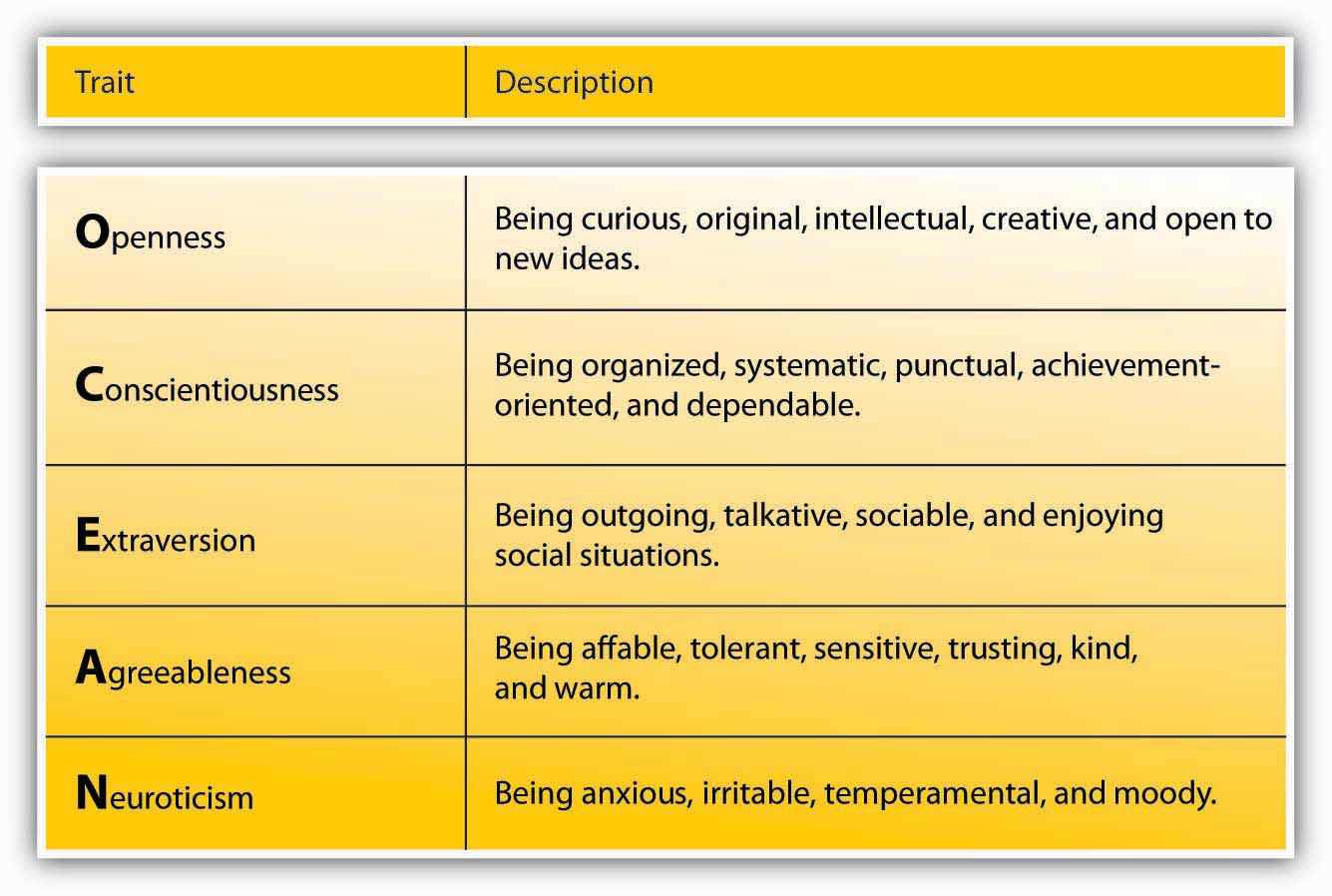 Psychologists have proposed various systems for categorizing the characteristics that make up an individual’s unique personality; one of the most widely accepted is the “Big Five” model, which rates an individual according to Openness to experience, Conscientiousness, Extraversion, Agreeableness, and Neuroticism. Several of the Big Five personality traits have been related to leadership emergence (whether someone is viewed as a leader by others) and effectiveness.Judge, T. A., Bono, J. E., Ilies, R., & Gerhardt, M. W. (2002). Personality and leadership: A qualitative and quantitative review. Journal of Applied Psychology, 87, 765–780.