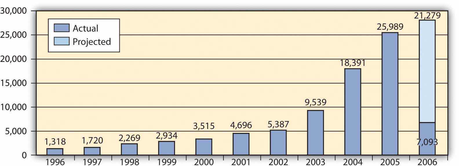 Mortgage fraud can be perpetrated by the borrower, appraiser, or loan officer who originates the loan. Figure 9.15 "Mortgage Loan Fraud in the United States" shows mortgage fraud in the United States through 2006—had the graph continued, you would see even more fraud in 2007, just before the recent housing bubble burst.