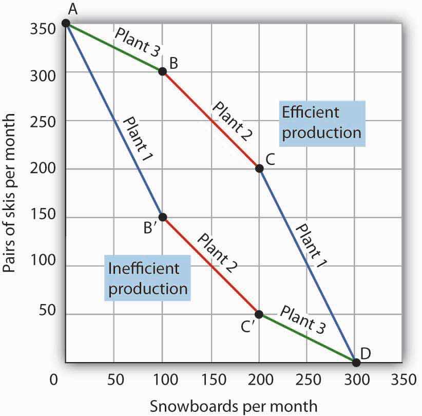 When factors of production are allocated on a basis other than comparative advantage, the result is inefficient production. Suppose Alpine Sports operates the three plants we examined in Figure 2.3 "Production Possibilities at Three Plants". Suppose further that all three plants are devoted exclusively to ski production; the firm operates at A. Now suppose that, to increase snowboard production, it transfers plants in numerical order: Plant 1 first, then Plant 2, and finally Plant 3. The result is the bowed-in curve AB′C′D. Production on the production possibilities curve ABCD requires that factors of production be transferred according to comparative advantage.