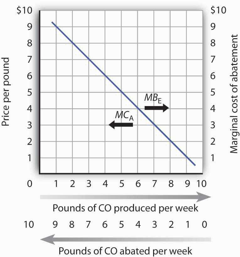 As shown in Panel (b) of Figure 18.4 "The Efficient Level of Emissions and Pollution Abatement", application of the marginal decision rule suggests that the efficient level of abatement effort is to reduce pollution by 4 pounds of CO produced per week. That is, reduce the level of pollution from the 10 pounds per week that would occur at a zero price to 6 pounds per week. For any greater effort at abating the pollution, the marginal cost of the abatement efforts would exceed the marginal benefit.
