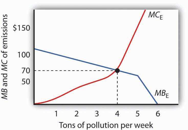 The efficient quantity of emissions is found at the intersection of the demand (DT) and marginal cost (MCT) curves in Panel (c) of Figure 18.1 "Determining the Efficient Level of Pollution", with 34 units of the pollutant emitted. The marginal benefit of the 34th unit of emissions, as measured by the demand curve DT, equals its marginal cost, MCT, at that level. The quantity at which the marginal benefit curve intersects the marginal cost curve maximizes the net benefit of an activity.