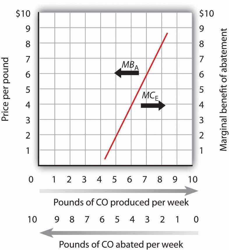 Like the marginal benefit curve for emissions, the marginal cost curve can be interpreted in two ways, as suggested in Figure 18.3 "The Marginal Cost of Emissions and the Marginal Benefit of Abatement". When read from left to right, the curve measures the marginal cost of additional units of emissions (MCE). If increasing the motorists’ emissions from four pounds of carbon monoxide per week to five pounds of carbon monoxide per week imposes an external cost of $2, though, the marginal benefit of not being exposed to that unit of pollutant must be $2. The marginal cost curve can thus be read from right to left as a marginal benefit curve for abating emissions (MBA). This marginal benefit curve is, in effect, the demand curve for cleaner air.