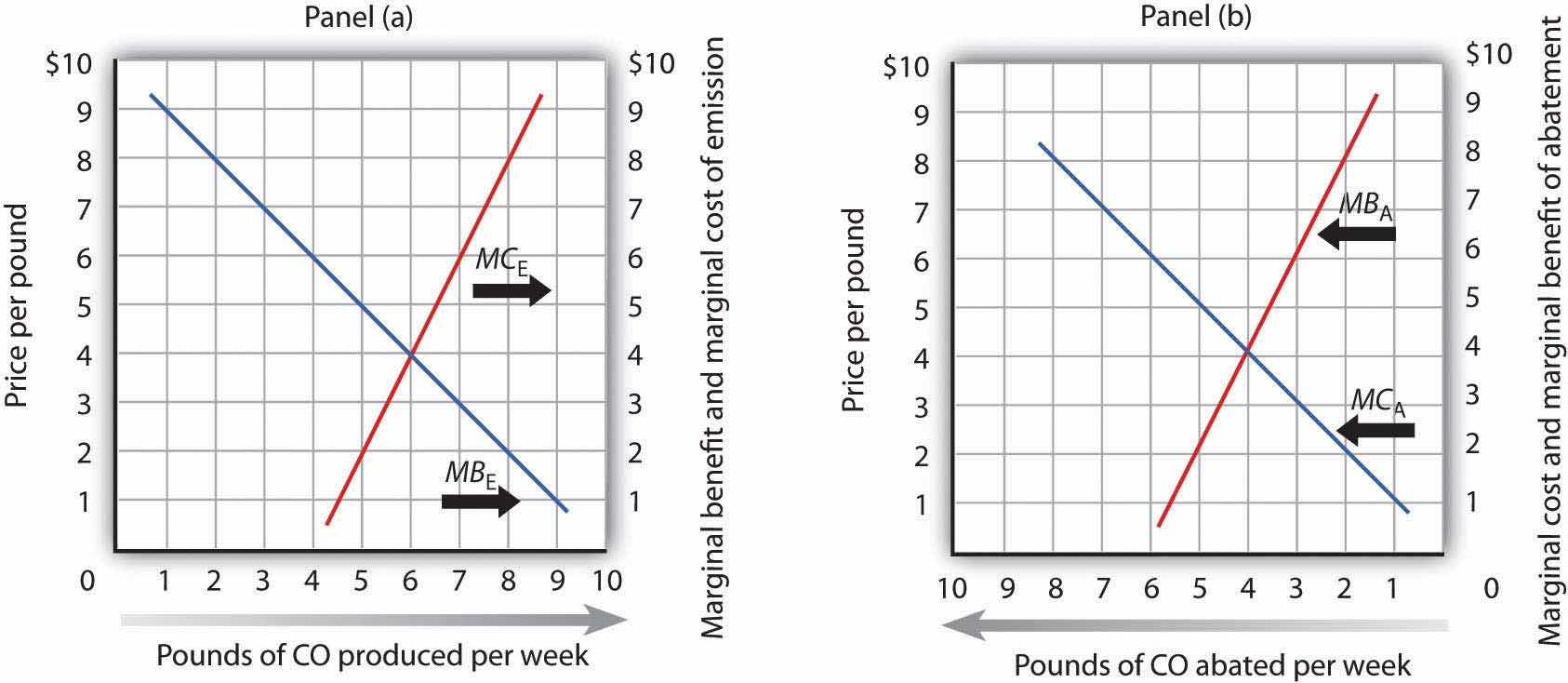 Whether economists measure the marginal benefits and marginal costs of emissions or, alternatively, the marginal benefits and marginal costs of abatement, the policy implications are the same from an economic perspective. As shown in Panel (a) of Figure 18.4 "The Efficient Level of Emissions and Pollution Abatement", applying the marginal decision rule in the case of emissions suggests that the efficient level of pollution occurs at six pounds of CO emitted per week. At any lower level, the marginal benefits of the pollution would outweigh the marginal costs. At a higher level, the marginal costs of the pollution would outweigh the marginal benefits.