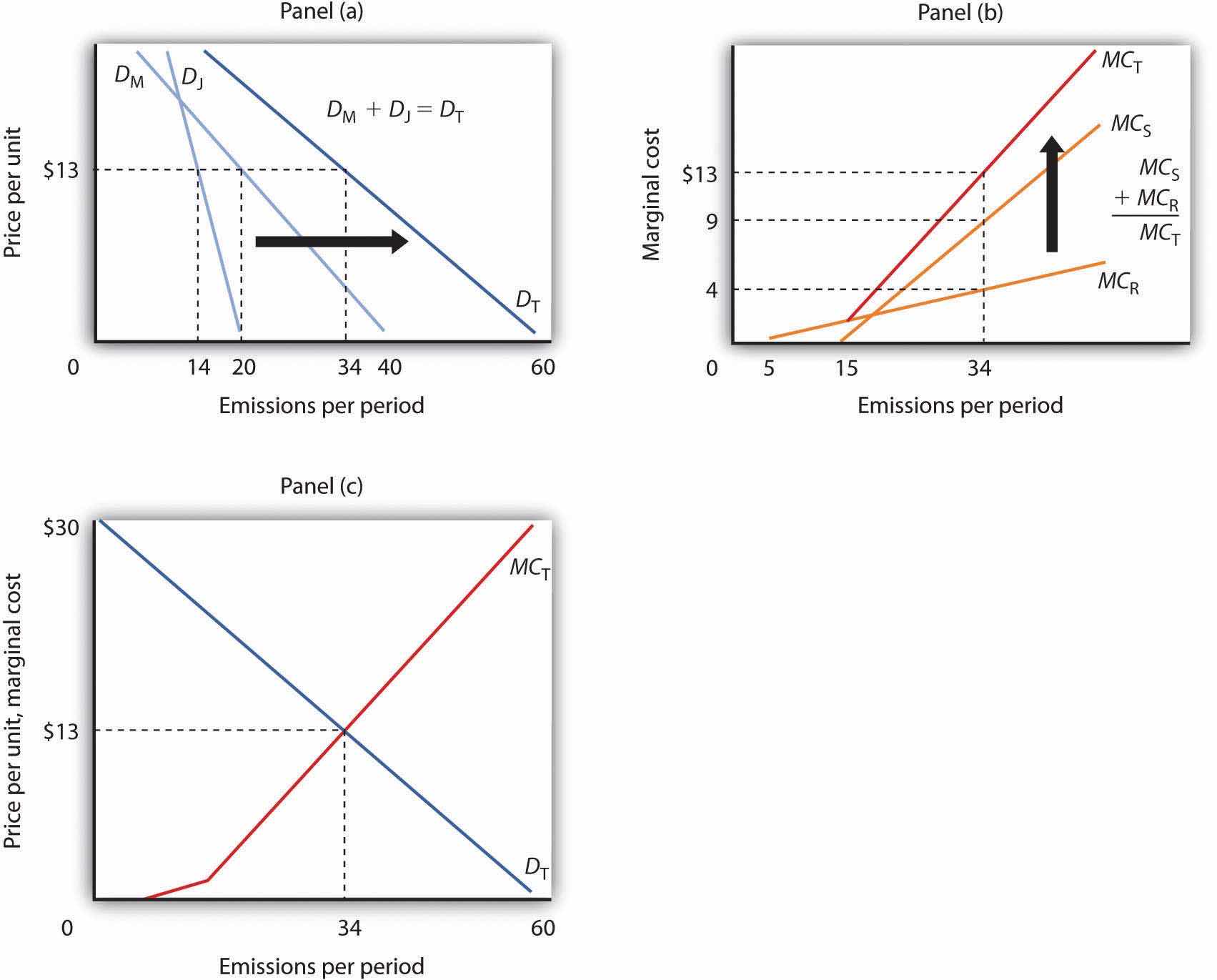 Mary’s and Jane’s demand curves for pollution are shown in Panel (a). These demand curves, DM and DJ, show the quantities of emissions each generates at each possible price, assuming such a fee were assessed. At a price of $13 per unit, for example, Mary will emit 20 units of pollutant per period and Jane will emit 14. Total emissions at a price of $13 would be 34 units per period. If the price of emissions were zero, total emissions would be 60 units per period. Whatever the price they face, Mary and Jane will emit additional units of the pollutant up to the point that their marginal benefit equals that price. We can therefore interpret their demand curves as their marginal benefit curves for emissions. Their combined demand curve DT gives the marginal benefit to society (that is, to Mary and Jane) of pollution. Each person in our problem, Mary, Jane, Sam, and Richard, follows the marginal decision rule and thus attempts to maximize utility.
