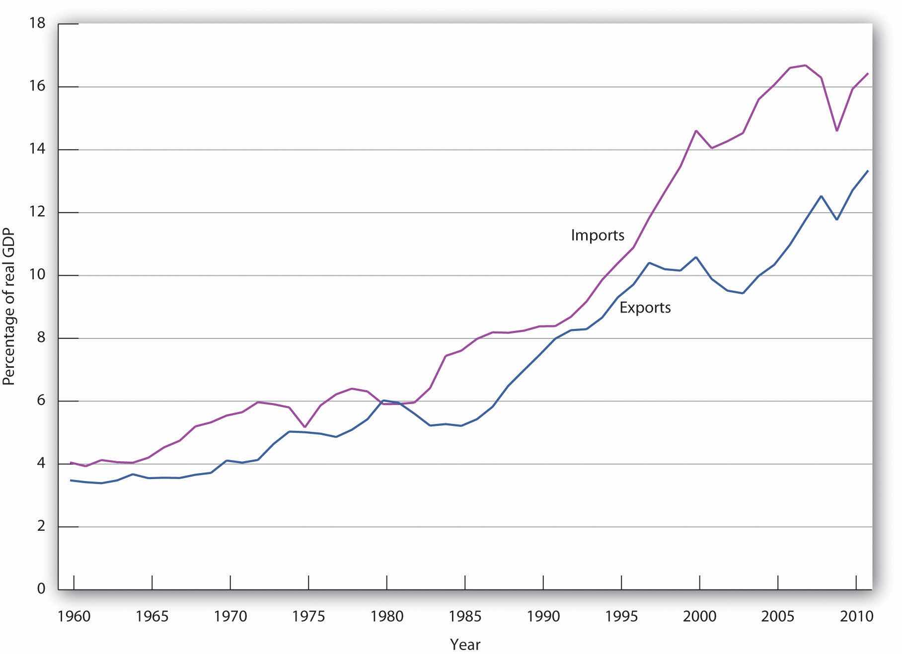 The chart shows exports and imports as a percentage of real GDP from 1960 through 2011.