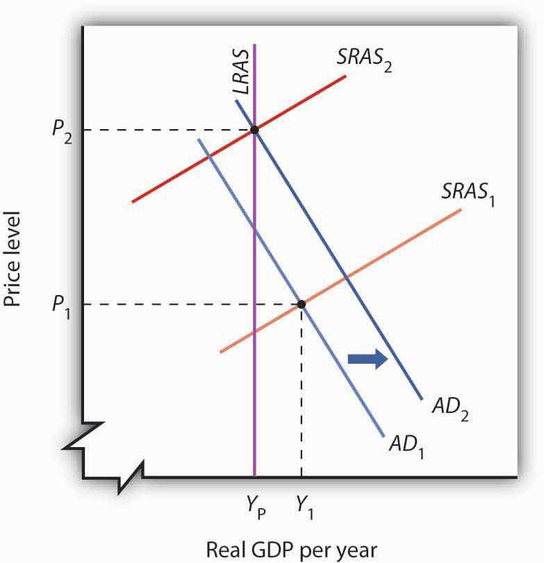 Even with an inflationary gap, it is possible to pursue expansionary fiscal and monetary policies, shifting the aggregate demand curve to the right, as shown. The inflationary gap will, however, produce an increase in nominal wages, reducing short-run aggregate supply over time. In the case shown here, real GDP rises at first, then falls back to potential output with the reduction in short-run aggregate supply.