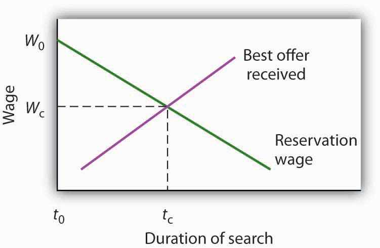 An individual begins a job search at time t0 with a reservation wage W0. As long as the reservation wage exceeds the best offer received, the individual will continue searching. A job is accepted, and the search is terminated, at time tc, at which the reservation and “best-offer-received” curves intersect at wage Wc.