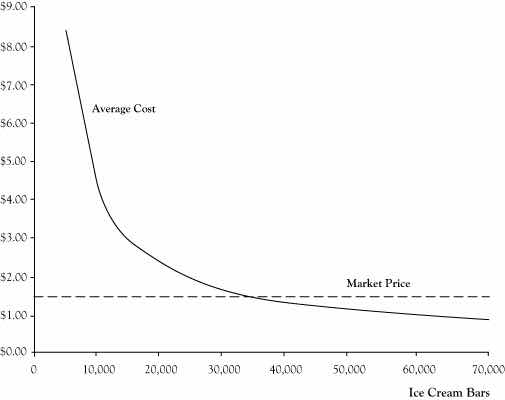 The average costThe total cost divided by the quantity produced; AC = C/Q. is another interesting measure to track. This is calculated by dividing the total cost by the quantity. The relationship between average cost and quantity is the average cost function. For the ice cream bar venture, the equation for this function would be