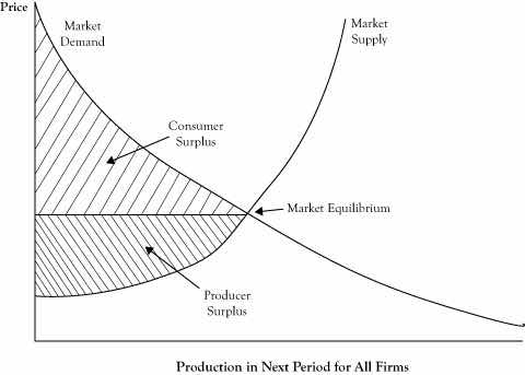 At least in theory, we could imagine taking all the units that would be purchased at the equilibrium price and using the location of each unit purchase on the demand curve to determine the maximum amount that the buyer would have been willing to pay to purchase that unit. The difference between what the customer would have paid to buy a unit and the lower equilibrium price he actually paid constitutes a kind of surplus that goes to the buyer. If we determined this surplus for each item purchased and accumulated the surplus, we would have a quantity called consumer surplusThe difference between what consumers would pay to buy a unit of a good or service and a lower equilibrium price that they actually pay; the area under the demand curve down to a horizontal line corresponding to the market equilibrium price.. Using a graph of a demand curve, we can view consumer surplus as the area under the demand curve down to the horizontal line corresponding to the price being charged, as shown in Figure 6.11 "Graph of Market Demand and Market Supply Curves Showing the Consumer Surplus and Producer Surplus When the Market Is in Perfect Competition Equilibrium".