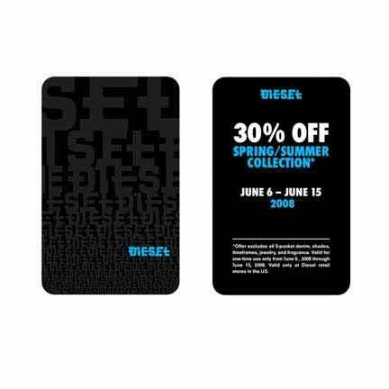 When customers made a purchase at the clothing chain Diesel, they were given a bounce back card to be used during certain dates as shown in this photo. The bounce back card gets customers back in the store for additional purchases.