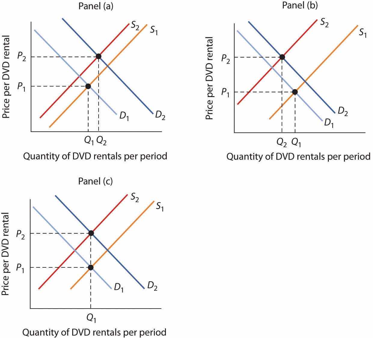 If the curves shifted by the same amount, then the equilibrium quantity of DVD rentals would not change [Panel (c)].