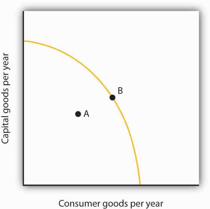 Use a production possibilities curve to illustrate the impact of discrimination on the production of goods and services in the economy. Label the horizontal axis as consumer goods per year. Label the vertical axis as capital goods per year. Label a point A that shows an illustrative bundle of the two which can be produced given the existence of discrimination. Label another point B that lies on the production possibilities curve above and to the right of point A. Use these two points to describe the outcome that might be expected if discrimination were eliminated.
