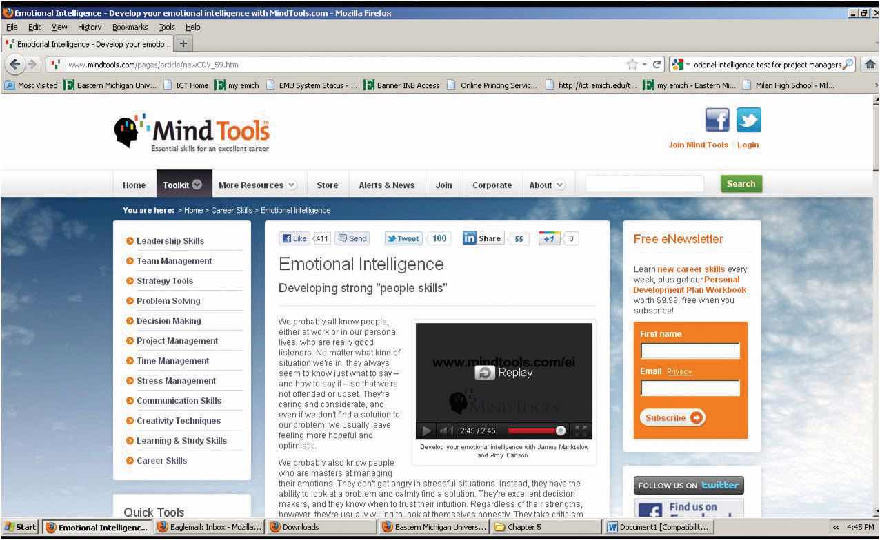 | Describe the characteristics of emotional intelligence | First line with name; four screen captures that show the video playing and the first few questions of the EQ test; a reflective essay of two hundred to three hundred words in which you describe what you learned and how it might be useful on a project | Correct screen captures with a reflective essay between one hundred and two hundred words | Some screens missing; very brief essay that did not cover both objectives |