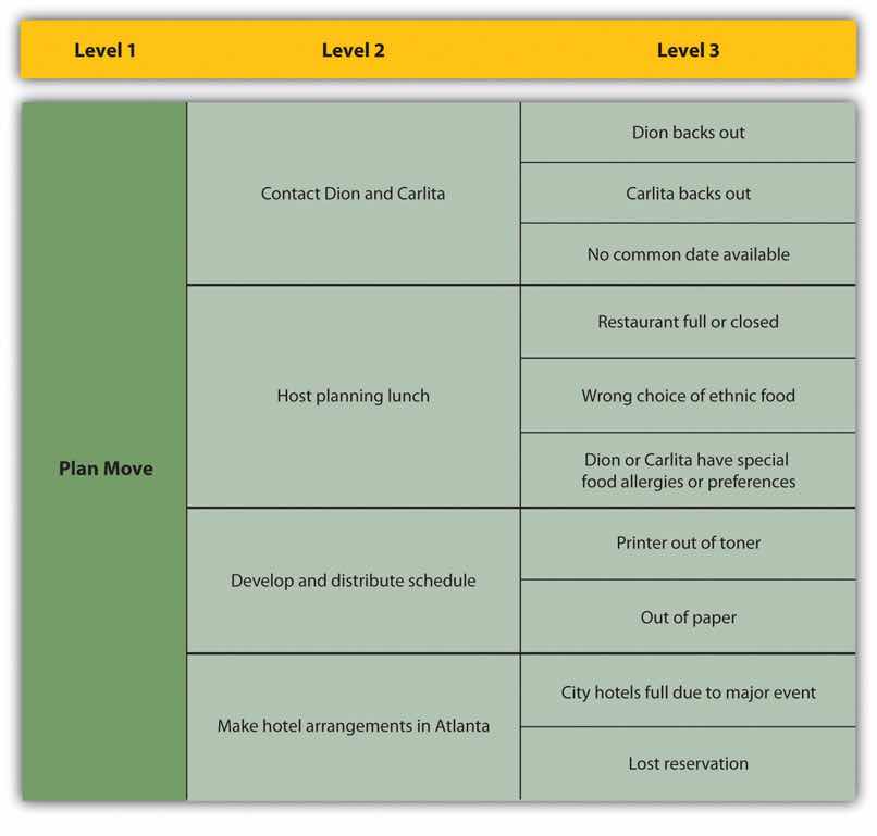 In John’s move, John makes a list of things that might go wrong with his project and uses his work breakdown structure as a guide. A partial list for the planning portion of the RBS is shown below.
