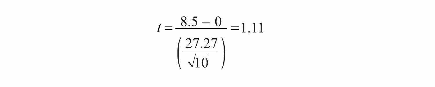 The mean of the difference scores is 8.50 with a standard deviation of 27.27. The health psychologist can now compute the t score for his sample as follows: