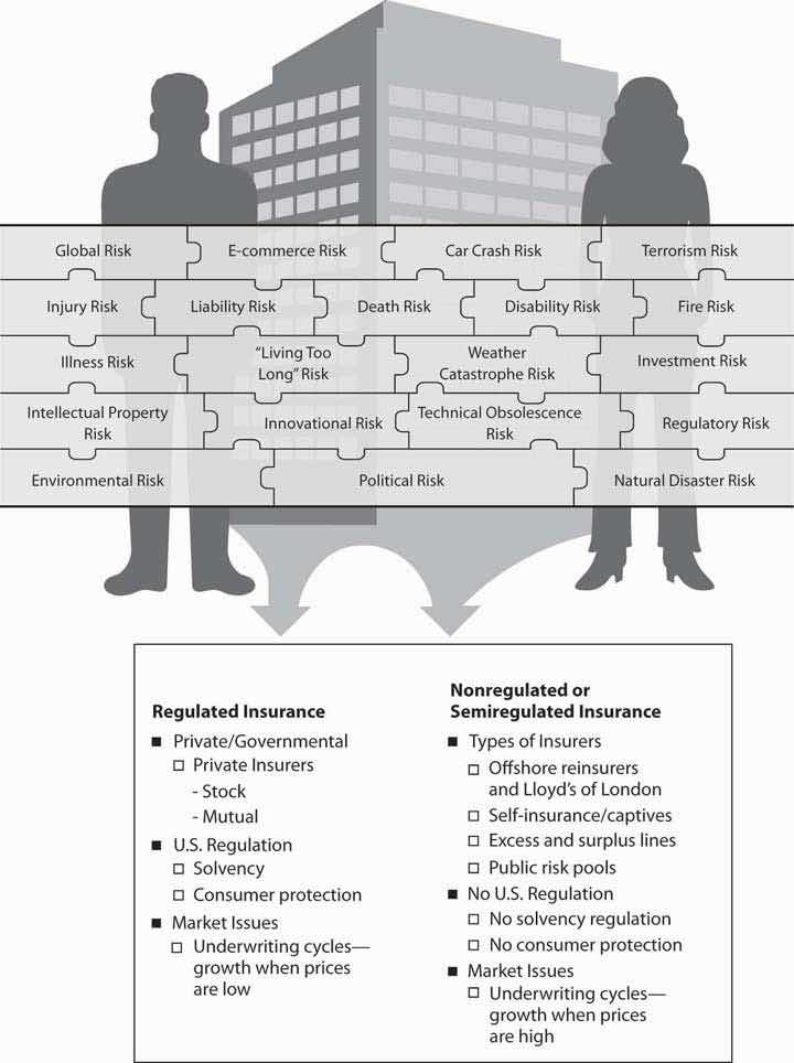 As you can see, understanding insurance institutions, markets, and insurance regulation are critical to our ability to complete the picture of holistic risk management. Figure 8.1 "Links between the Holistic Risk Picture and the Big Picture of the Insurance Industry Markets by Regulatory Status" provides the line of connection between our holistic risk picture (or a business holistic risk) and the big picture of the insurance industry and markets. Figure 8.1 "Links between the Holistic Risk Picture and the Big Picture of the Insurance Industry Markets by Regulatory Status" separates the industry’s institutions into those that are government-regulated and those that are non- or semiregulated. Regardless of regulation, insurers are subject to market conditions and are structured along the same lines as any corporation. However, some insurance structures, such as governmental risk pools or Lloyd’s of London, do have a specialized organizational structure.