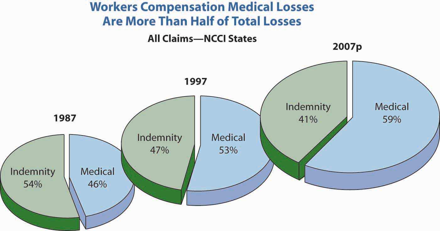 Workers’ compensation was one of the coverages that helped the families who lost their breadwinners in the attacks of September 11, 2001. New York City and the state of New York suffered their largest-ever loss of human lives. Because most of the loss of life occurred while the employees were at work, those injured received medical care, rehabilitation, and disability income under the New York workers’ compensation system, and families of the deceased received survivors’ benefits. The huge payouts raised the question of what would happen to workers’ compensation rates. The National Council on Compensation Insurance (NCCI) predicted a grim outlook then, but by 2005, conditions improved as frequency of losses declined and the industry’s reserves increased.Dennis C. Mealy, FCAS, MAAA, Chief Actuary, NCCI, Inc., “State of the Line,” May 8, 2008; Orlando, Florida, 2008; NCCI Holdings, Inc. The workers’ compensation line has maintained this strong reserve position and has been helped by a continual downward trend in loss frequency. Consequently, the industry reported a combined ratio of 93 percent in 2006 and projects a 99 percent combined ratio for 2007. This indicates positive underwriting results. However, medical claims severity (in contrast to frequency) has continued to grow, as shown in Figure 16.1 "Changes in the Distribution of Medical versus Indemnity Claims in Workers’ Compensation*".
